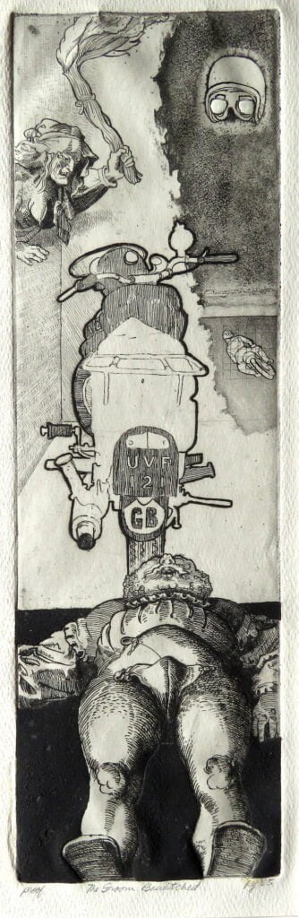 Acquired directly from the artist, this thoughtful etching, “Adjusting the Tappets”, shows the introspective nature of much of Robert Young’s work.