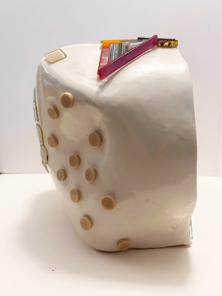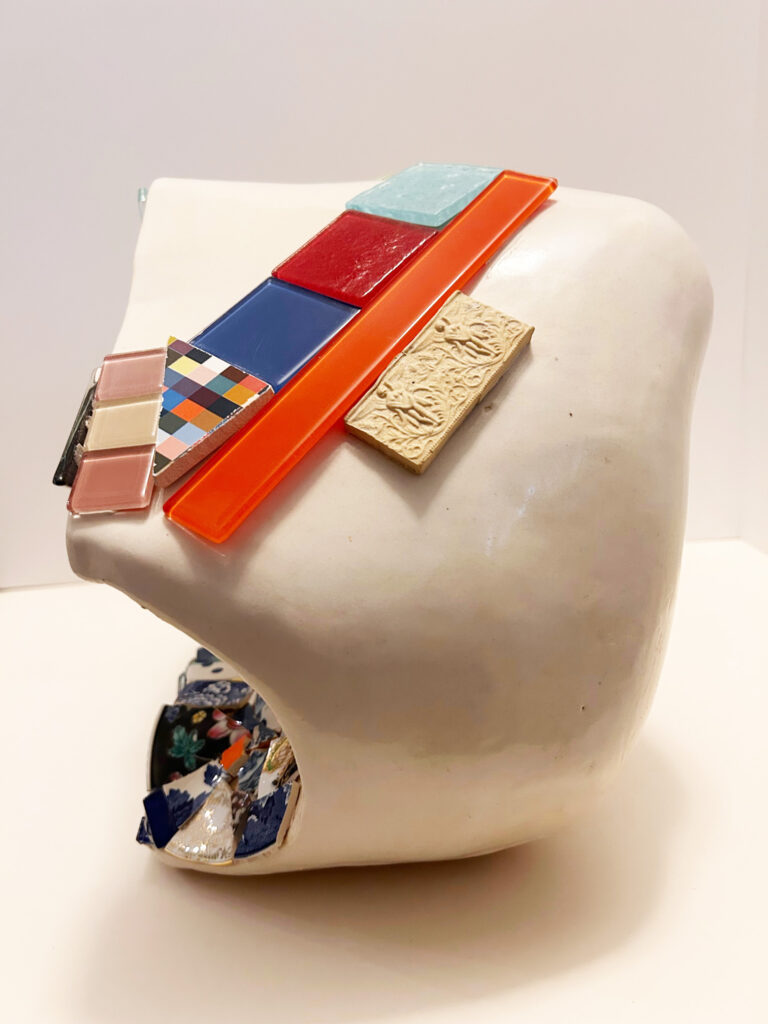 White ceramic clay form with the impression of a face deep on the inside. Decorated with colourful glass tiles and opaque coloured glazes. When the shadows change, the negative face shape surprisingly takes on the appearance of a positive three-dimensional form, staring at the viewer. "What does it mean?" you might ask.