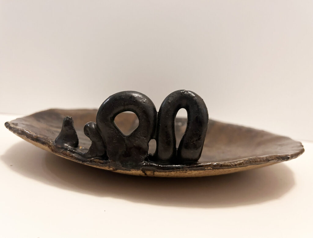 An irregularly round-shaped, dark earth-brown glazed stoneware plate with an incised child-like drawing that appears to be a country road bordered by three trees. On one side, there is an ornamental clay figure of two small loops and a cone, that rises above the plate edge, similar to a handle, but it doesn't appear to be functional.