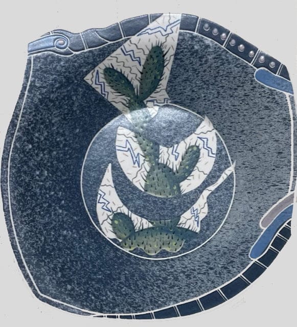 A balance is created between an irregular-shaped form of the bowl, the controlled white lines around the edges, and the circle in the centre. The image of the prickly pear cactus is spiky, the background in white has blue and green lines like lightning while the large areas of blue have a consistent but dotted texture. Visually, it is prickly to the eyes but our sense touch encounters a silky-smooth sensation.