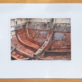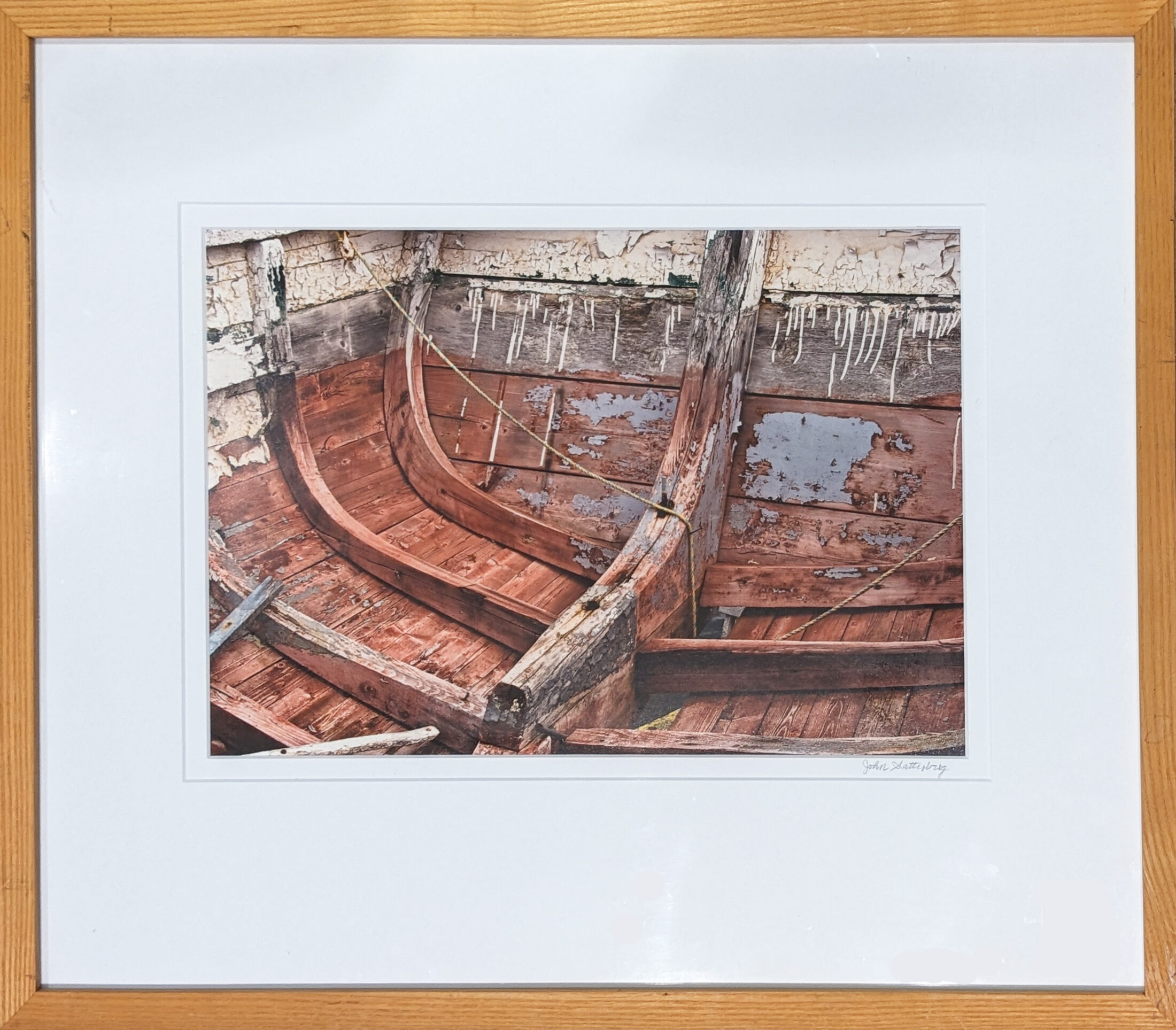 This close up of a Newfoundland dory interior shows layers of weathered paint which form an abstract image. The direction of the ribs and the planking are traversed by a thin plastic rope carrying the eye from one side to the other.