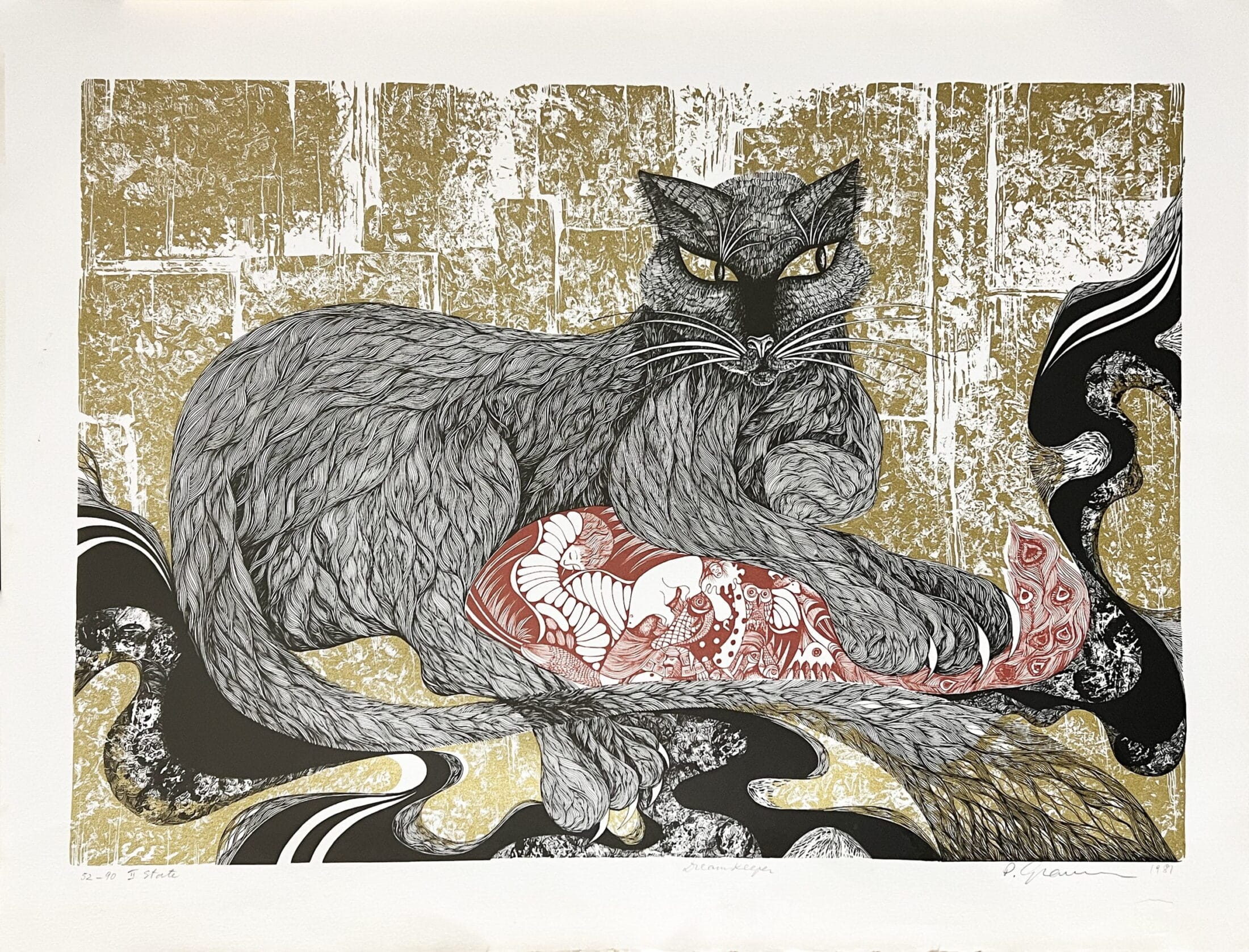 An intriguing interplay of pattern between the cat's fur, textiles and background create a striking composition featuring a sly and watchful feline. Find some other hidden images - a child, a peacock's head, a tail with the eyes of a peacock, but what animal is it?