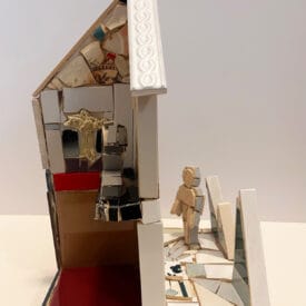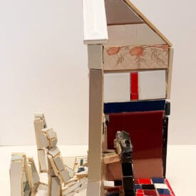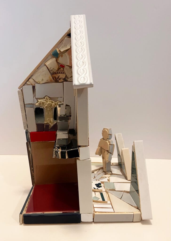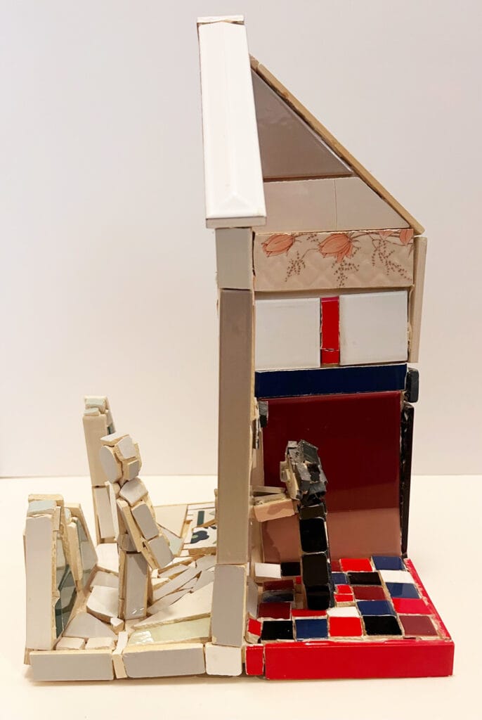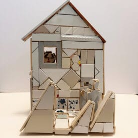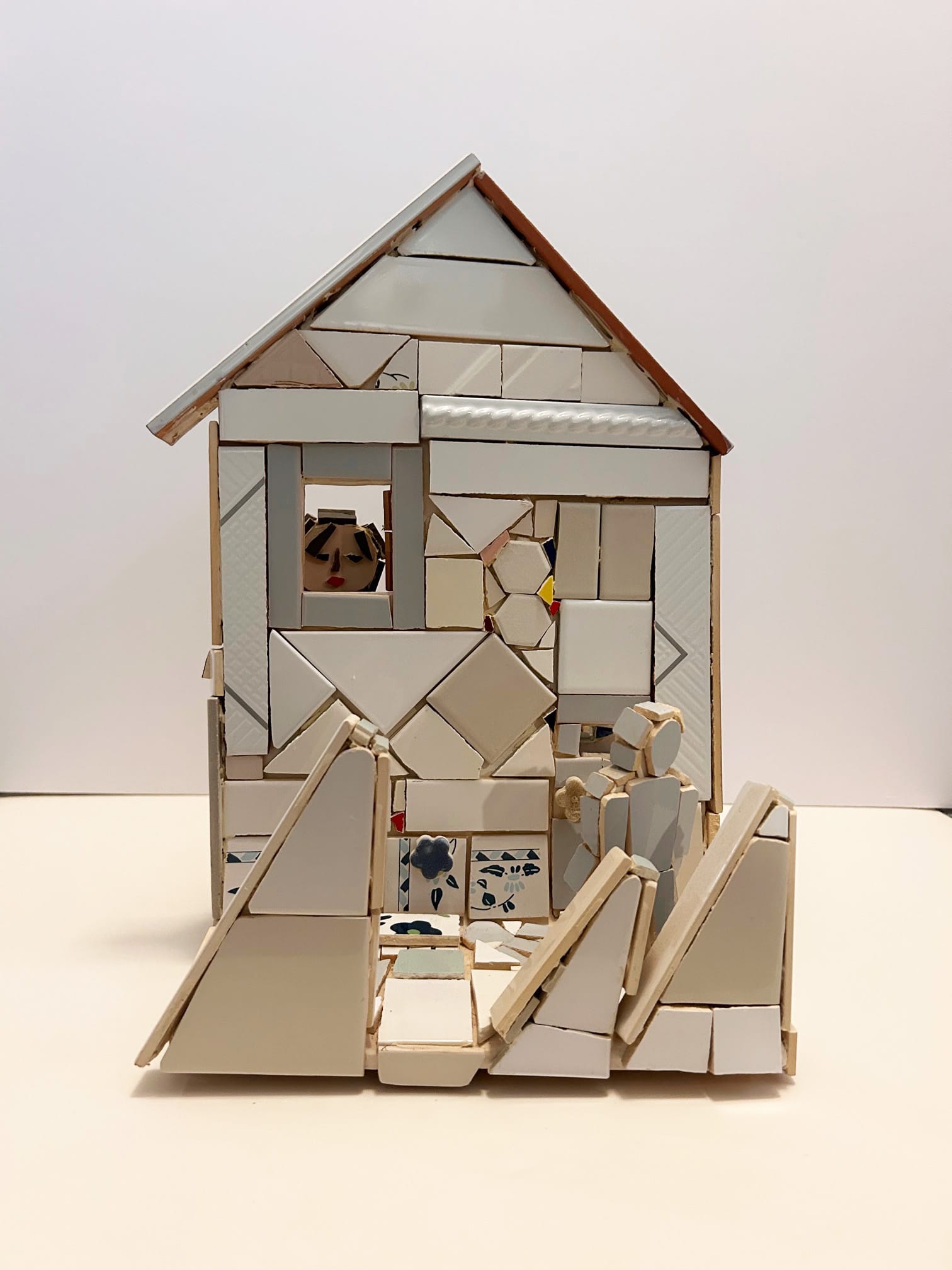 A model house without exterior walls invites the viewer to see all around this construction. A woman's head looks out of a kitchen window while on the reverse side, a man stands in the courtyard.